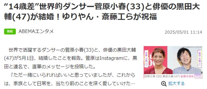 33岁的舞蹈与47岁的资深演员黑田大辅,在社交媒体上晒出手写信官宣了结婚的喜讯