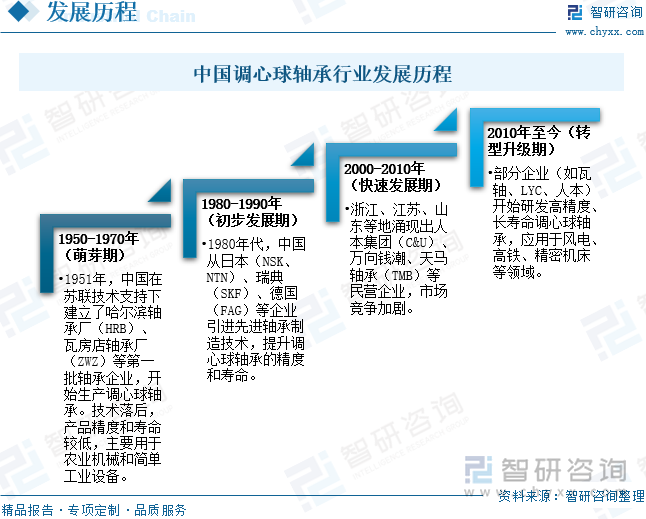 中国调心球轴承行业的发展历程可追溯至20世纪50年代,经历了1950-1970年的萌芽期、1980-1990年的初步发展期、2000-2010年的快速发展期以及2010年至今的转型升级期。1951年,中国在苏联技术支持下建立了哈尔滨轴承厂(HRB)、瓦房店轴承厂(ZWZ)等第一批轴承企业,开始生产调心球轴承。技术落后,产品精度和寿命较低,主要用于农业机械和简单工业设备。1980年代,中国从日本(NSK、NTN)、瑞典(SKF)、德国(FAG)等企业引进先进轴承制造技术,提升调心球轴承的精度和寿命。进入21世纪,浙江、江苏、山东等地涌现出人本集团(C&U)、万向钱潮、天马轴承(TMB)等民营企业,市场竞争加剧。2010年以来,部分企业(如瓦轴、LYC、人本)开始研发高精度、长寿命调心球轴承,应用于风电、高铁、精密机床等领域。