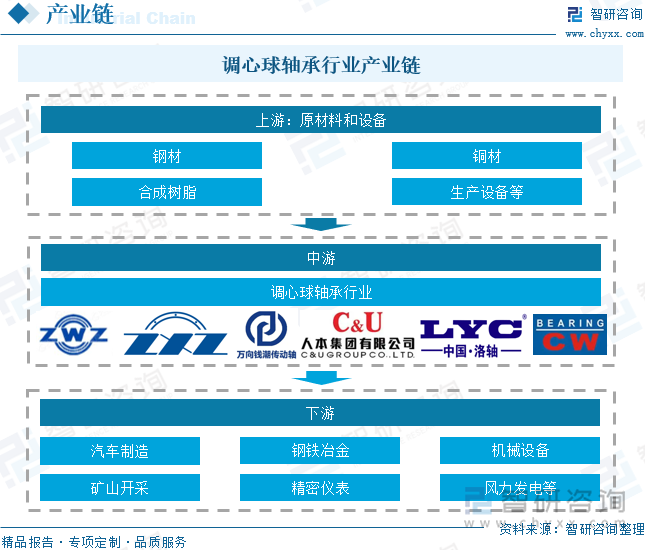 从产业链环节来看,调心球轴承产业链上游包括原材料和生产设备供应,其中,原材料主要包括钢材、铜材、合成树脂等。产业链中游为调心球轴承的生产制造。在下游,调心球轴承凭借其承载力高、抗冲击力强、旋转稳定、经久耐用等特点,被广泛应用于汽车制造、钢铁冶金、机械设备、矿山开采、精密仪表、风力发电等多个领域。在汽车制造领域,调心球轴承主要用于变速箱、传动轴、轮毂单元等关键部件的支撑与旋转;在钢铁冶金行业,调心球轴承被广泛应用于轧机、连铸机、高炉设备等重型机械的传动系统;在通用机械设备中,调心球轴承是各类泵体、压缩机、减速机等设备的核心支承元件;在矿山开采领域,调心球轴承被用于破碎机、球磨机、输送设备等大型机械的承载部位;在精密仪表制造中,调心球轴承为精密测量仪器和光学设备提供高精度旋转支撑;在风力发电领域,调心球轴承则是风机主轴、偏航系统和变桨系统的重要功能部件,保障机组在复杂工况下的稳定运行。