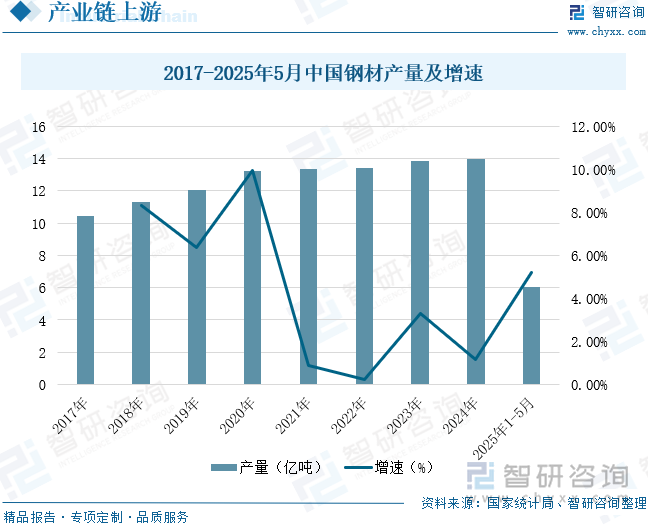 作为调心球轴承的核心材料,钢材凭借其优异的高硬度和耐磨特性,为轴承产品提供了关键的高负荷承载能力和长寿命保障。中国钢材行业经过二十余年的快速发展,不仅确立了全球最大钢材生产国和消费国的领先地位,更形成了完整的产业体系。近年来,随着国内工业生产的持续复苏和制造业转型升级步伐加快,钢材市场需求保持稳定增长态势,推动我国钢材产量实现平稳上升。国家统计局数据显示,2024年中国钢材产量从2017年的10.46亿吨增长至14亿吨,年复合增长率为4.25%。2025年1-5月,中国钢材产量为6.06亿吨,同比增长5.2%。未来,在钢材产量持续增长的有利条件下,中国调心球轴承行业将迎来更广阔的发展空间,为高端装备制造和工业转型升级提供强有力的支撑。