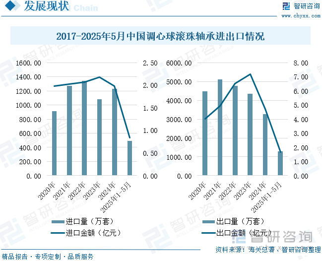 中国作为滚动轴承技术的发源地之一,经过百余年的发展已建立起全球领先的轴承产业体系。早在1916年,我国就在上海、瓦房店、哈尔滨、洛阳等地建立了首批轴承制造基地,奠定了产业发展的基础。进入21世纪后,随着民营轴承企业的快速崛起,中国轴承行业实现了从规模扩张到质量提升的跨越式发展,产品竞争力显著增强并畅销全球市场。中国海关数据显示,中国调心球滚珠轴承以出口为主。2024年中国调心球滚珠轴承进口量为1230.6万套;进口金额为1.98亿元,出口量为3252.04万套;出口金额为4.71亿元。2025年1-5月,中国调心球滚珠轴承进口量为488.27万套;进口金额为0.83亿元,进口量为1297.84万套;进口金额为1.66亿元。