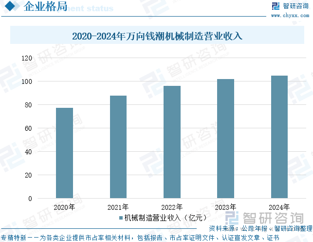 万向钱潮股份公司创业50多年来,专门致力于汽车零部件的研发及制造,并为汽车零部件模块化提供系统化、协同化的解决方案。专业生产万向节、传动轴、等速驱动轴、轮毂单元、轴承、制动器、汽车电子、传动系统、制动系统、悬架系统、燃油箱及后处理系统等零部件及总成。万向节及轮毂单元产品居全球领先;传动轴、等速驱动轴、轴承等产品居国内领先。为奔驰、宝马、丰田、大众、通用、福特、一汽、上汽、广汽、中国重汽等重点用户长期稳定供货。据统计,2024年万向钱潮机械制造营业收入为104.9亿元,同比增长3.13%。