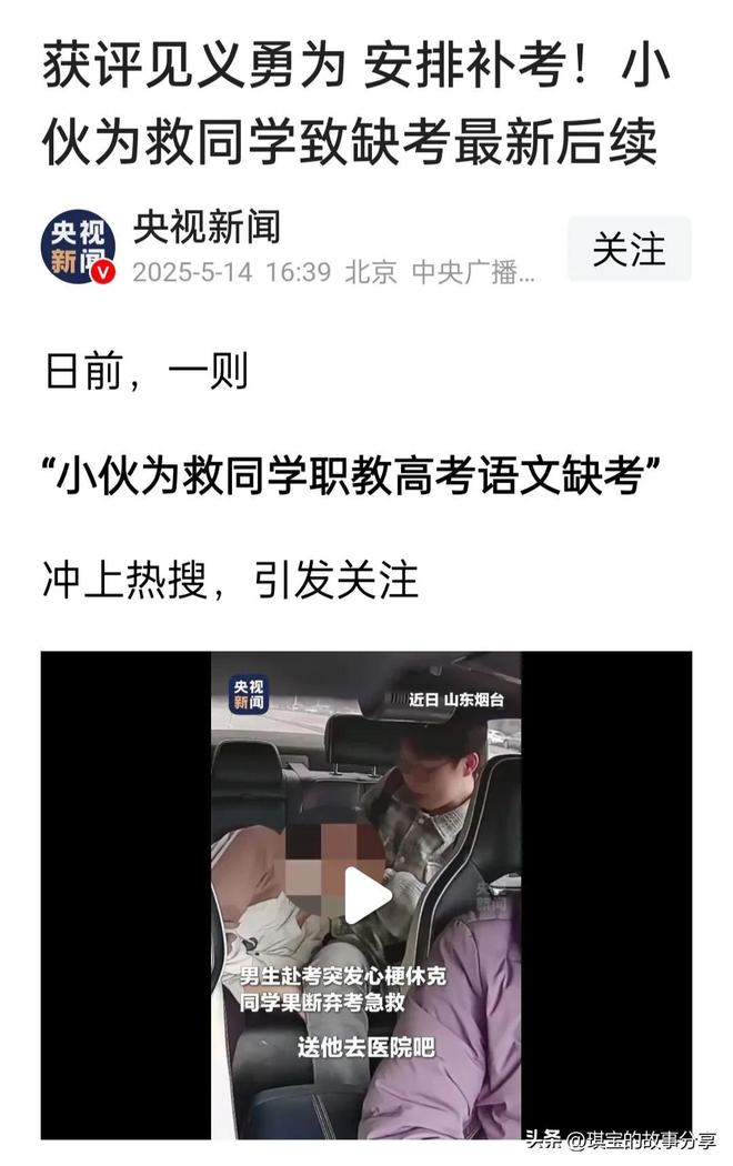 2025年5月10日8点50分,经急诊抢救,同学恢复心跳。姜昭鹏浑身是汗地冲向考点时,语文考试已开考15分钟。面对紧闭的考场大门,他攥着皱巴巴的准考证呆立良久。事后他坦言:“考试可以重来,但生命只有一次,我不后悔。”