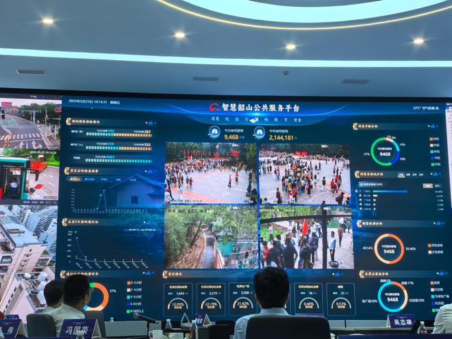 每天的旅游情况以数据化的方式精准呈现。比如,5月22日,韶山游客接待数为9371人次,消费金额达到2144.6万元,在重点视频监控区域,可以看到各个卡口的交通情况,车流分析也在实时更新数据。通过各卡口的实时监控,一旦出现交通拥堵就能立刻处置。在启动仪式上,韶山市公安局、市文旅广体和商务局还联合开展模拟,生动呈现如何运用智慧手段,有效疏导重点路段交通卡口的拥堵情况,以及高峰期商务通行证办理熔断机制的运行逻辑。