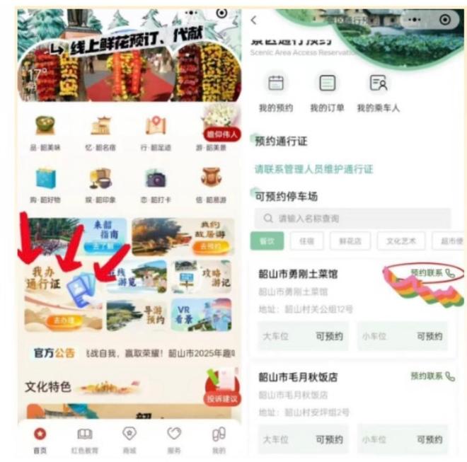 进入景区有两种方式,一是车辆办理通行证后即可进入,二是去换乘中心乘坐大巴。自驾的游客就可以进入“韶山一机游”首页“我办通行证”选项,提前预约景区车辆通行证;非自驾的游客则可以进入“换乘购票”选项了解办理流程。
